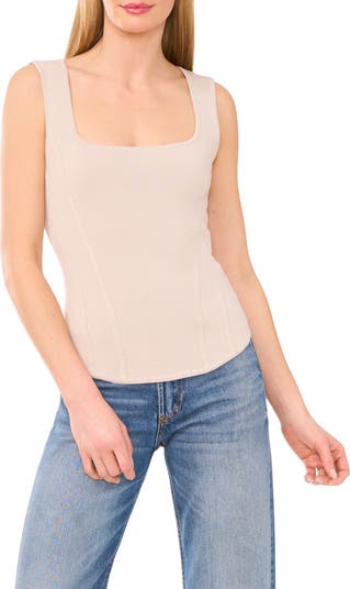A soft sweater-tank is updated with a sharp square neck and a close-fitting corseted silhouette.