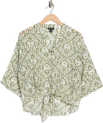 A tie-front detail at the hem shapes this Ikat-print top framed by a split neck and three-quarter sleeves for breezy, sun-ready appeal.