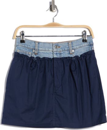 A denim waist leads to a woven skirt on this unique mixed-media piece detailed with sporty toggle drawcords.