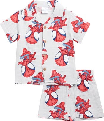 Playtime gets a heroic upgrade with this camp shirt and shorts set cut from cotton gauze and covered in an allover Spider-Man print.