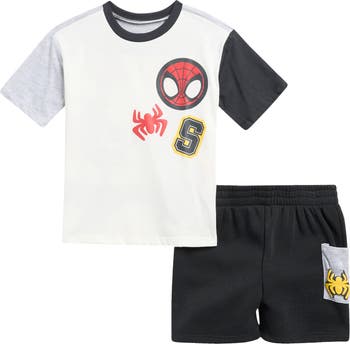 Playtime gets a heroic upgrade with this jersey T-shirt and fleece shorts set covered in an allover Spider-Man print.