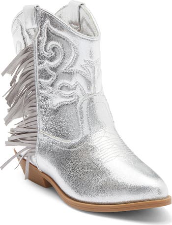 Bring some Western glam to their everyday looks with this metallic boot detailed with stitched patterns, side pull-tabs and flowy fringe.
