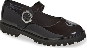 A toothy lug sole adds a playground-perfect finish to these on-trend Mary Jane flats featuring a glossy, patent finish.