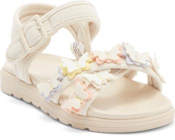 3-dimensional butterflies decorate the crossover vamp straps of a charming kids' sandal outfitted with a contoured footbed for playground comfort.