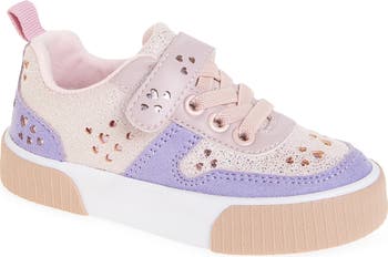 Foiled hearts add kid-approved charm to a low-profile sneaker fashioned with stretchy laces and an adjustable strap that offers them a customizable fit.