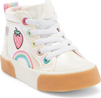 Brighten your kid's day with this soft leather pull-on sneaker featuring rainbow grommets and trim, elastic laces and a nonmarking grip sole.