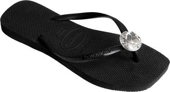 A chunky rhinestone punctuates the straps of this glam flip-flop fashioned from flexible, premium Brazilian rubber.
