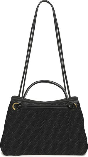 Elevate any outfit with this woven leather tote bag featuring adjustable straps and a divided interior to keep your essentials organized.