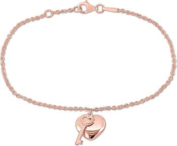 An engraved lock and key charm suspend from this slender chain bracelet crafted from sterling silver or 10-karat-gold plate or rose-goldtone plate.