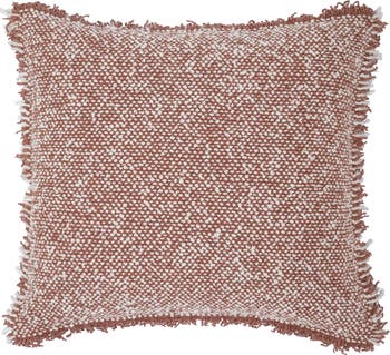 A fringe trim lends textural interest to the heathered weave of this accent pillow crafted from a blend of light and dark yarns.