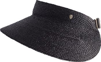 Breezy braided raffia shapes a lightweight visor crafted with an adjustable strap for a comfortable fit.