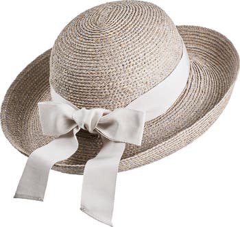 A turned-up brim makes a classic finish for a breezy raffia hat trimmed with a wide grosgrain bow.