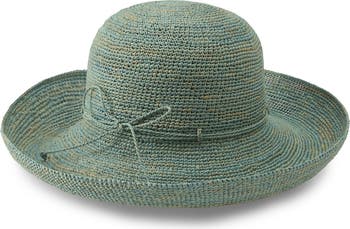This rollable, packable, hand-crocheted raffia sun hat has an inner neoprene band for comfort.