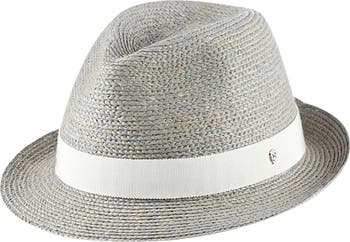 A grosgrain band circles a UV-blocking, breezy raffia fedora finished with a tiny, gleaming logo charm.