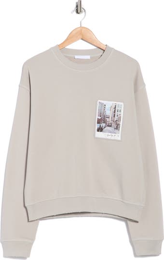 A postcard appliqué brings cool retro style to this slouchy pullover sweatshirt cut from cotton French terry with an artfully distressed finish.