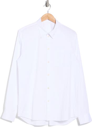 Elevate your wardrobe with this solid white button-up shirt cut from a breathable cotton blend with comfortable stretch.