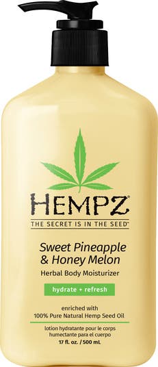 Hempz Sweet Pineapple & Honey Melon Herbal Body Moisturizer helps provide dramatic skin hydration and nourishment to help soften, smooth and condition the skin. Enriched with 100% Pure Natural Hemp Seed Oil, Pineapple Extract, Honey Melon Extract, Shea Butter and our signature Miracle Oil Blend to help refresh, rejuvenate and energize skin leaving it feeling soft, smooth and supple. Benefits: Enriched with 100% Pure Natural Hemp Seed Oil Paraben-Free, Gluten-Free, 100% Vegan, THC-free Miracle Oil Blend - Signature blend of essential oils effectively nourish skin helping to hydrate, repair and restore skins moisture barrier leaving skin soft, smooth, supple and nourished Pineapple Extract - helps to condition, soften and invigorate skin Honey Melon Extract - a natural antioxidant with Vitamin A and E properties to help hydrate and nourish skin Jojoba Seed Oil - natural anti-inflammatory properties help to provide even skin tone while keeping skin hydrated, nourished and conditioned. - Size: 17.0 fl. oz. - For directions and ingredients, see "Additional Info" - Made in USA