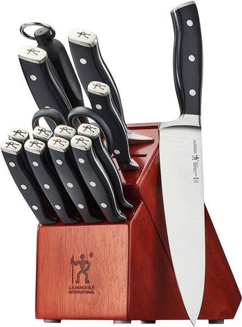 The 15-piece knife block set is stocked with all the tools you need to easily tackle your kitchen tasks. The set includes the all-rounder chef's knife, which is perfect for chopping herbs and dicing onions and a bread knife that cleanly slices through crusty sourdough. Efficiently mince garlic or slice vegetables with the hollow edge santoku, featuring a blade that has small indentations, known as grantons, that prevent food from sticking while cutting. Forged Accent knives are fabricated from high-quality German stainless steel, perfect for precision cutting.
