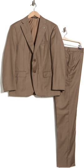 Subtly textured wool styled in a taupe sharkskin distinguishes a suit tailored with relaxed shoulders and fitted in the waist for a smart, streamlined look. The flat-front trousers complement the traditional detailing to keep the silhouette crisp and clean.