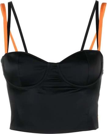 Branding at the back zipper and twin straps at each shoulder lend ultracool style to this cropped corset top designed with underwire cups for structure.