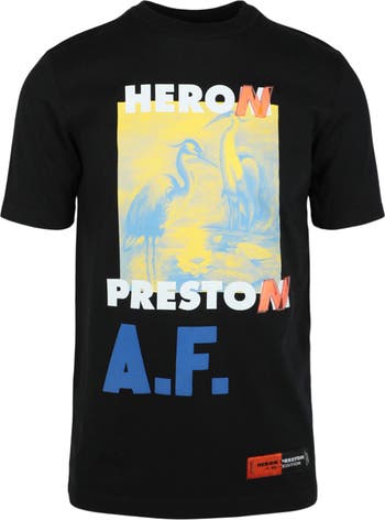 A vibrant graphic print fronts this stretch-enhanced crewneck T-shirt branded by a signature-orange logo patch at the hem.