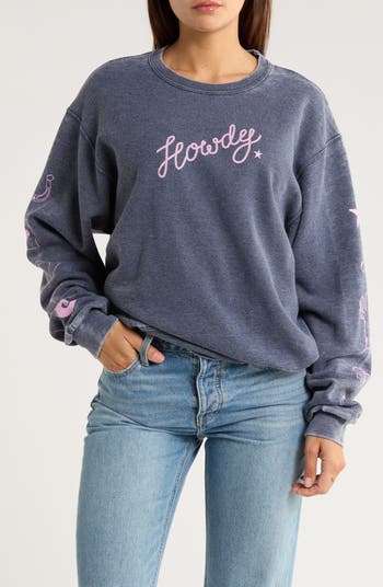 Western-inspired graphics brings and a faded hue add old-favorite status to this cotton-blend sweatshirt.