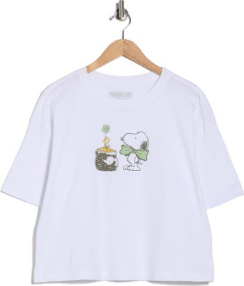 Celebrate St. Patty's Day with your favorite cartoon friends at the front of this boxy cotton T-shirt emblazoned with a festive graphic of Snoopy and Woodstock around a pot of gold.