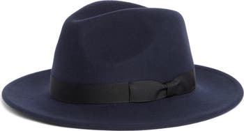 A classic fedora is crafted from felt wool and features a wide brim and grosgrain hatband.