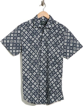 This short-sleeve shirt features a bold print on a textured seersucker base and is crafted from cotton, making it a standout addition to your casual warm-weather wardrobe.