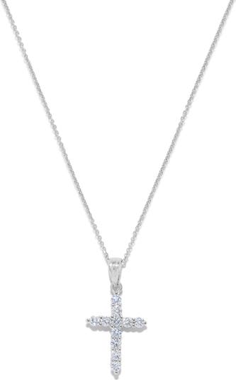 A petite cross is adorned with round-cut diamonds to elevate a reverent necklace crafted from gleaming 14-karat gold.