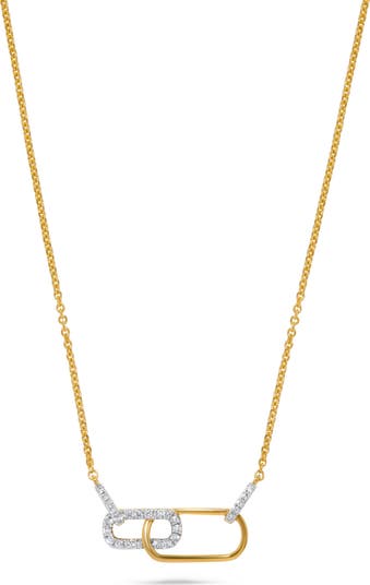 Dainty prong-set round diamonds illuminate this interlocking paper-clip link pendant necklace crafted from 14-karat gold with a polished two-tone finish.
