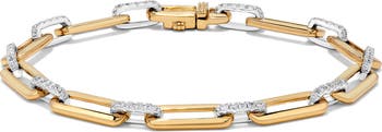 Dainty diamonds bring luminous sparkle to a two-tone paper-clip chain bracelet crafted from polished 14-karat gold.