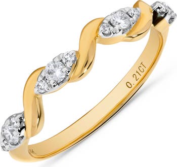 Dainty round diamond trios illuminate this stackable twisted-band ring crafted from 14-karat gold with a polished two-tone finish.