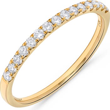 Round-cut diamonds sparkle along the contour of a slender, stackable ring crafted from exquisite 14-karat gold, offering a timeless, heirloom-quality design.