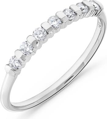 Round-cut diamonds sparkle in the channel of a slender, stackable ring crafted from exquisite 14-karat gold, offering a timeless, heirloom-quality design.
