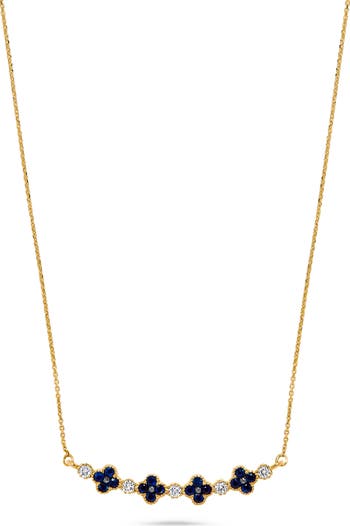 Dainty sapphires and white diamonds trace a polished pendant necklace for just-right sparkle.