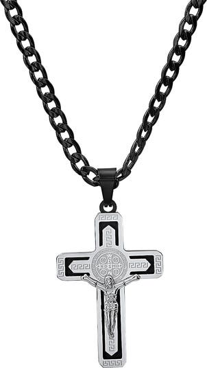 Add a meaningful accessory to your ensemble with a crucifix pendant featuring carved detailing on a blackened rolo chain necklace.