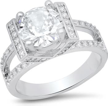 A round prong-set faceted simulated diamond adds an elegant touch to this 18-karat white gold-plated ring shimmering with rows of matching pavé accents.