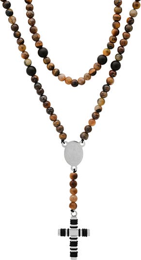 A meaningful gift, this beaded rosary Y-necklace features a saint and crucifix drop constructed from tiger's eye beads and 18-karat gold plated stainless steel.