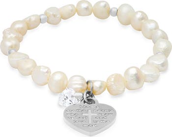 A sparkling simulated diamond heart and engraved stainless steel charm adorn an imitation pearl stretch bracelet that's the perfect gift for a special mom in your life.