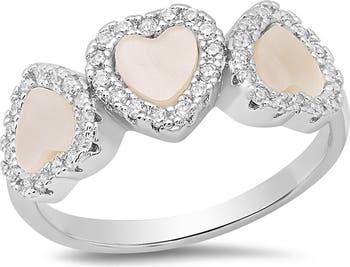 Add stunning sparkle to your look with this 18-karat white gold ring featuring mother-of-pearl heart accents surrounded by simulated diamond pavé.