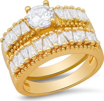 Tapered baguette-cut simulated diamonds and matching accents brings elegant sparkle to this statement-making ring set plated in gleaming 18-karat gold.