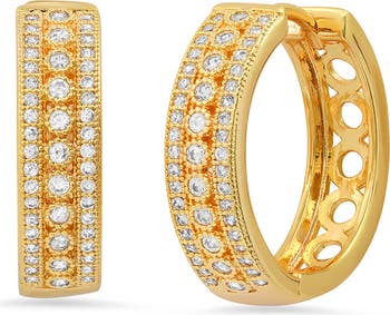 Glistening simulated diamonds accentuate a pair of snap post back hoop earrings for a refined, en vogue style.