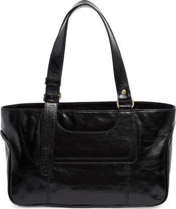 A glossy, polished leather and versatile silhouette give a practical charm to a structured satchel styled with brushed hardware.