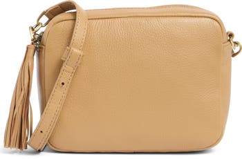 A tassel zipper pull and smooth leather exterior lend eye-catching elements to a compact bag fashioned with an adjustable crossbody strap.
