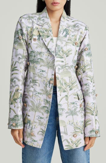 Intricate, pastoral patterns are elevated by shimmering accents on this Toile de Jouy inspired blazer that blends timeless elegance with modern polish. The supersoft linen-and-cotton blend keep you comfortable when temps rise.