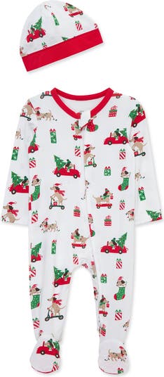 Festive print elevates a soft cotton footie featuring an easy zip closure and a coordinated hat for the perfect holiday look.