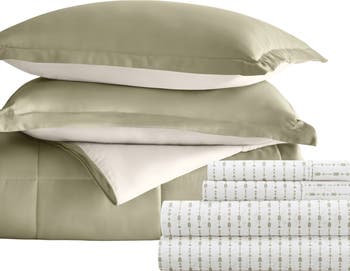 - Includes comforter, one flat sheet, one fitted sheet, two reversible shams and two pillowcases