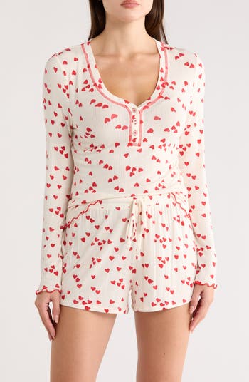 Drift off to dreamland or lounge around for movie night in these knit pajamas comprised of a henley and pull-on shorts.