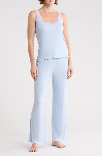 Drift off to dreamland or lounge around for movie night in these rib-knit pajamas featuring a lace‑trimmed tank and comfortable straight‑leg pants.